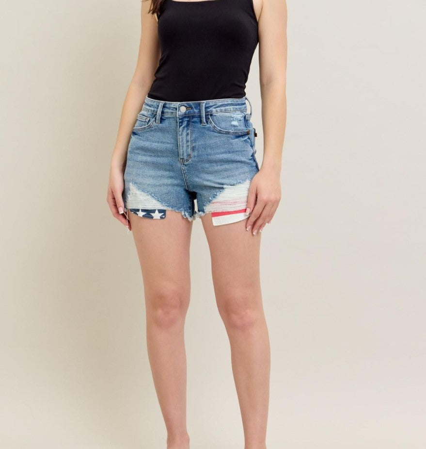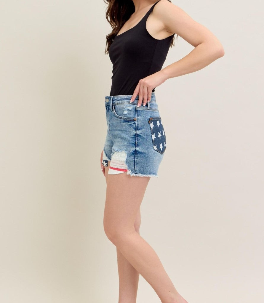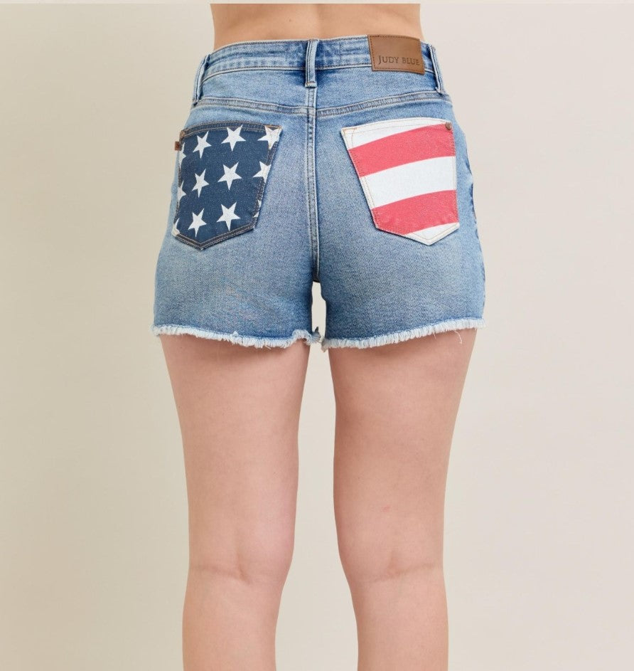 - HW Front & Back Pkt Americana Flag Print Fray Hem Shorts