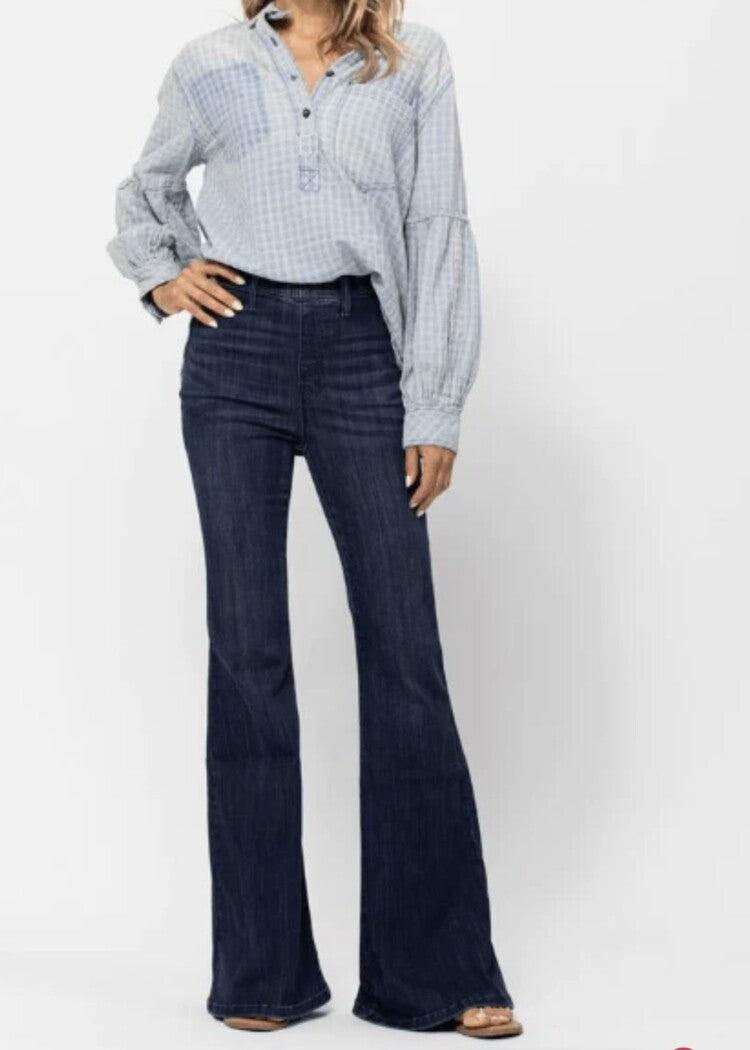 Judy Blue's High Waist Pull On Flare is designed for comfort and longevity. Constructed with an elastic waistband, stretchy fabric, and a long inseam, this jean is perfect for all occasions. We recommend always sizing down in Judy Blue.