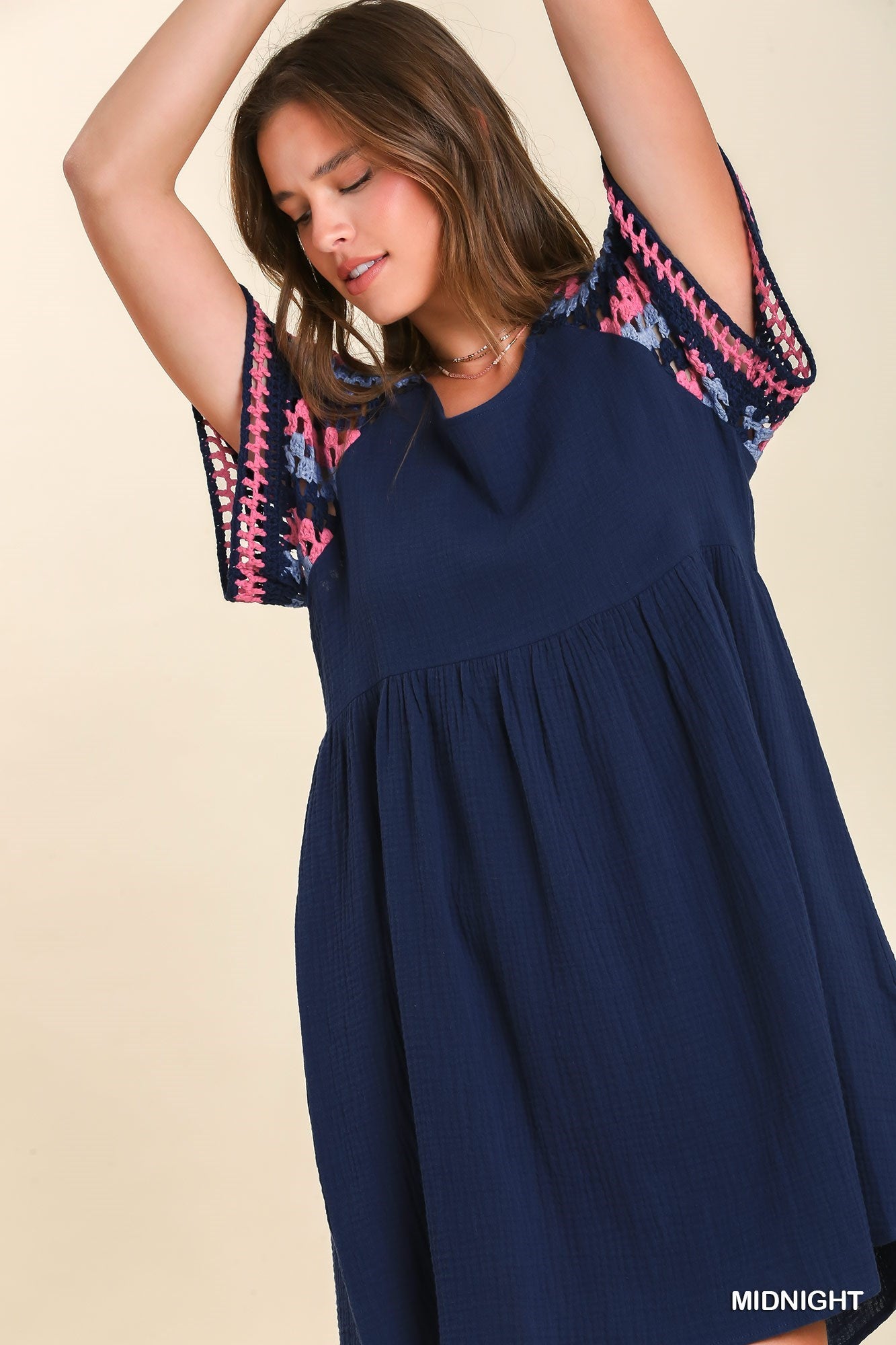 Gauze Fabric Round Neck Babydoll Dress with Checkerboard Pattern Crochet Short Sleeve