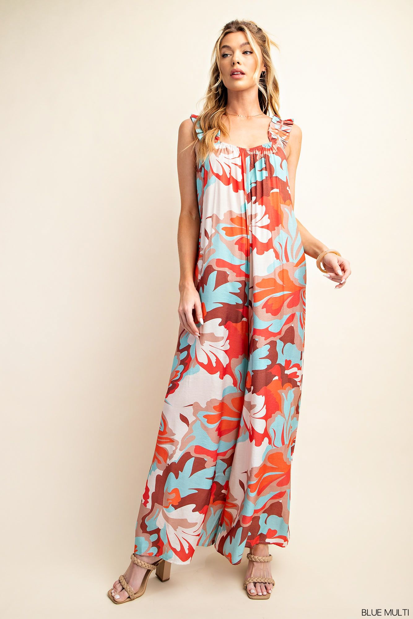 SOFT LINED RUFFLE PRINTED FABRIC JUMPSUIT WITH SIDE POCKETS