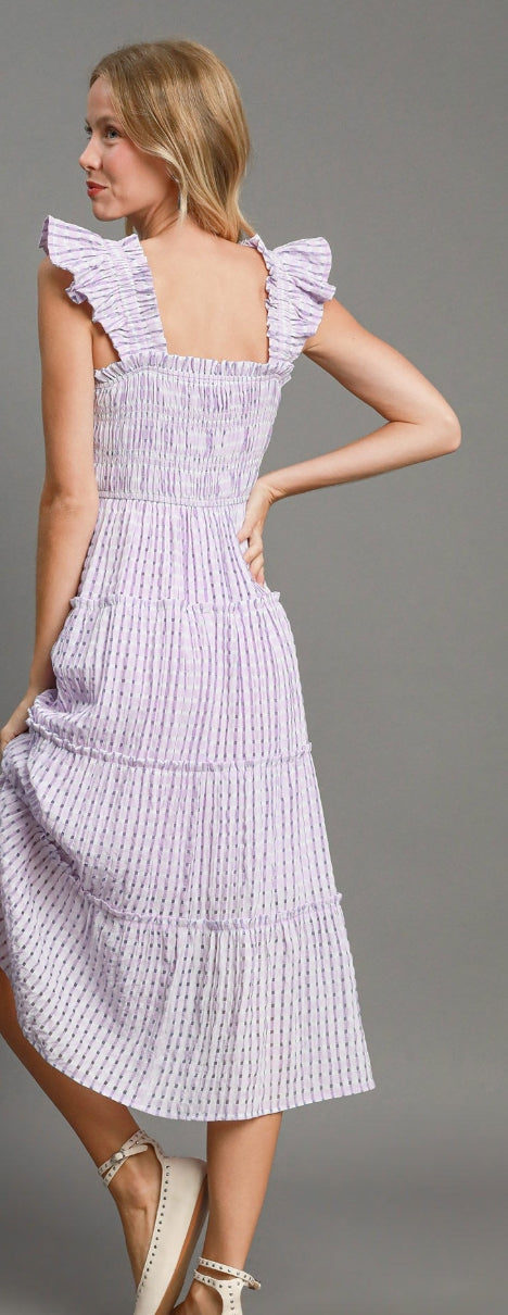 Checkered Seersucker Smocked A-Line Dress with Ruffle Tiered Details & Ruffle Flutter Sleeve in Lavender