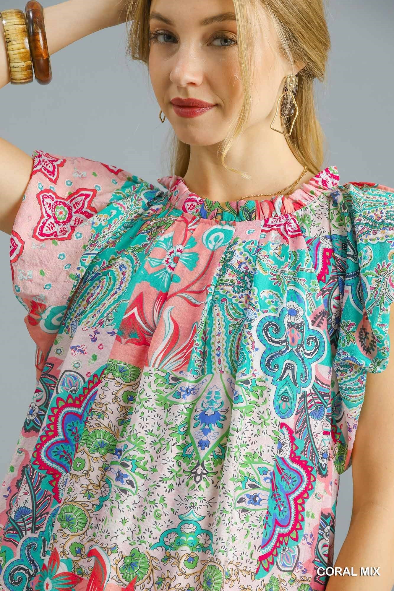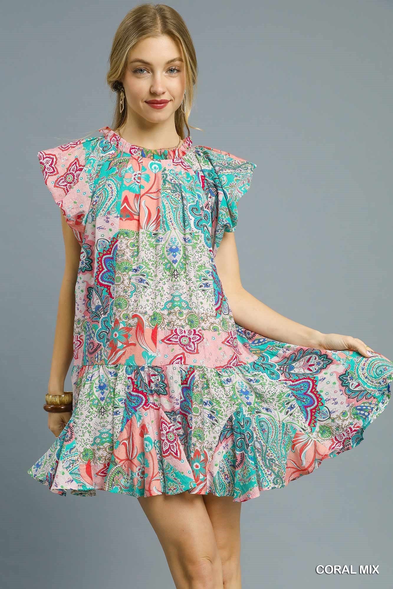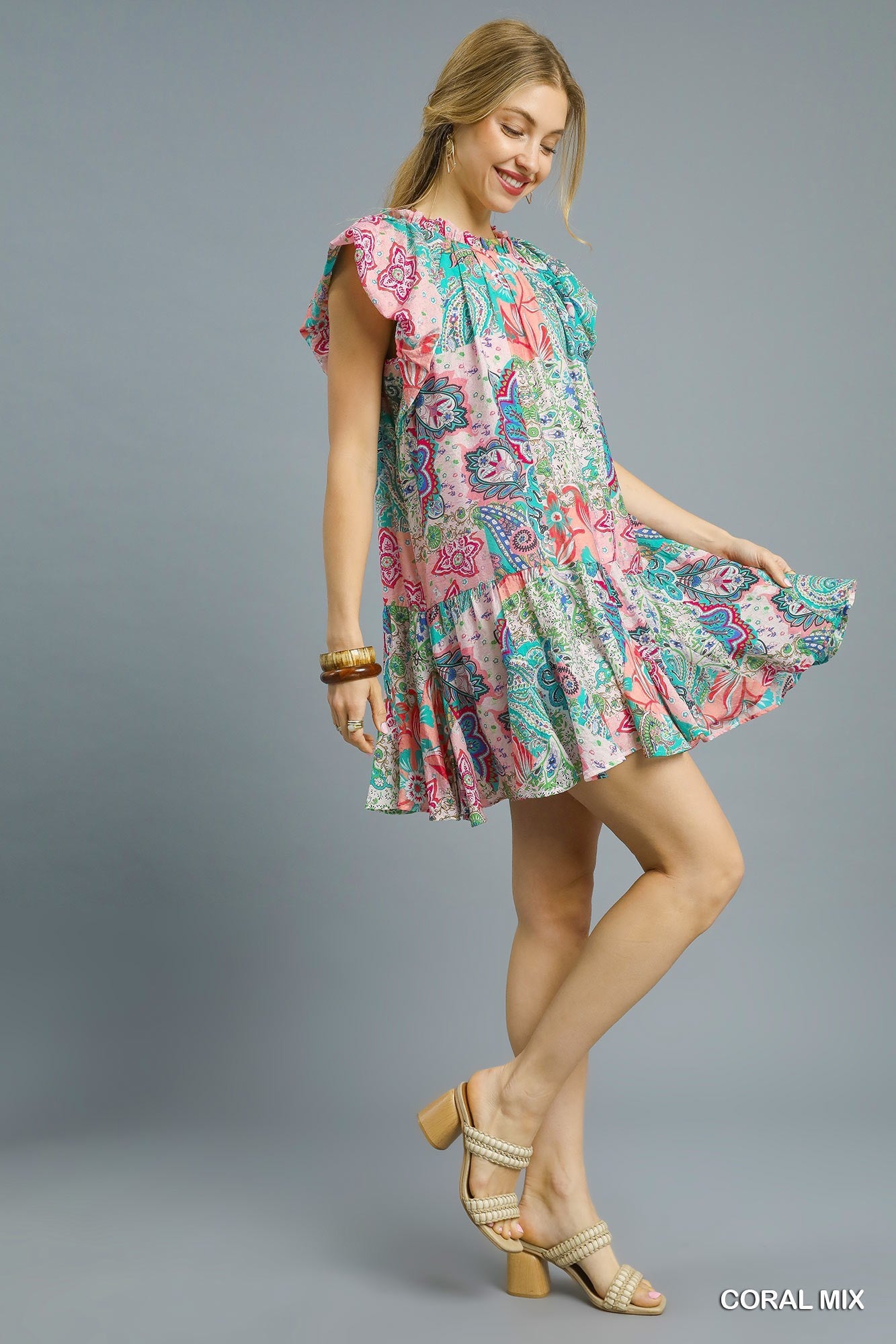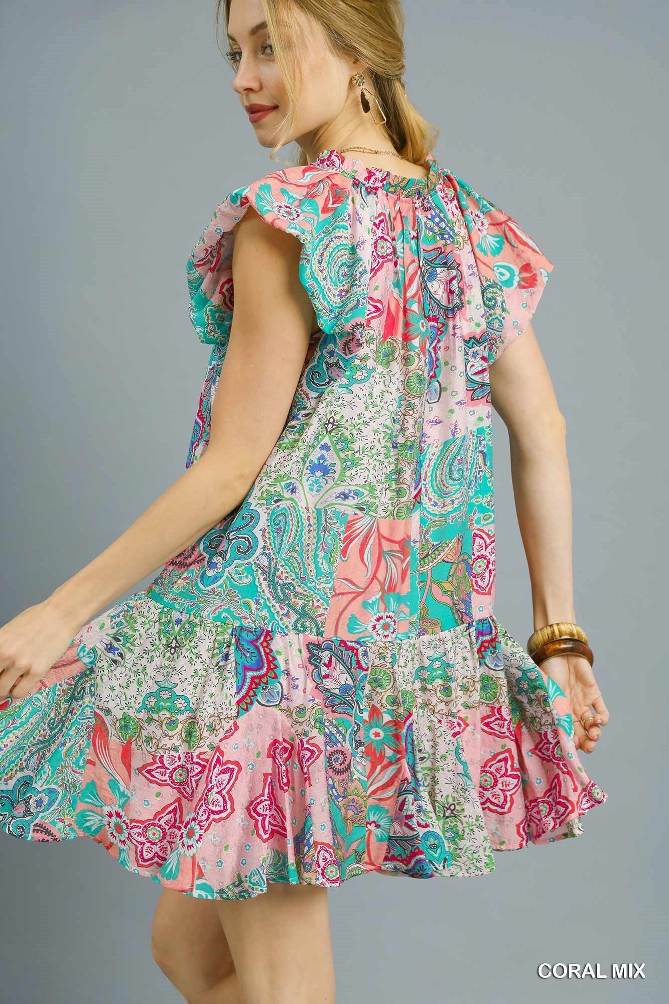 Patchwork Paisley Ruffle Sleeve Mini Dress