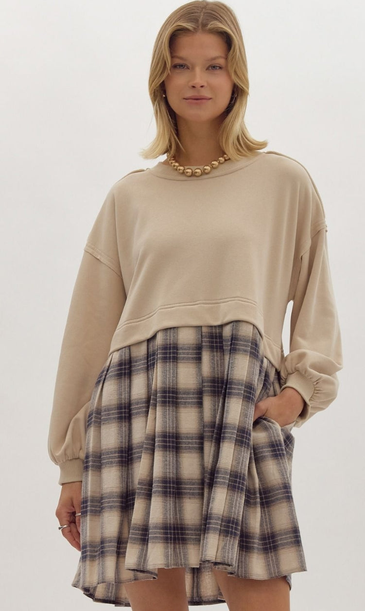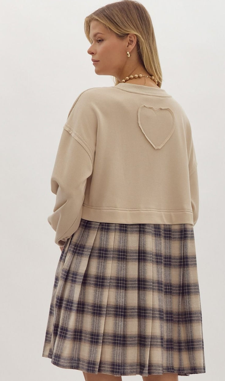 Get two looks in one with this Twofer long sleeve mini dress featuring a plaid skirt and heart detail at the back. Designed with pockets for convenience and made with a lightweight, non-sheer knit for comfort. Perfect for any occasion.