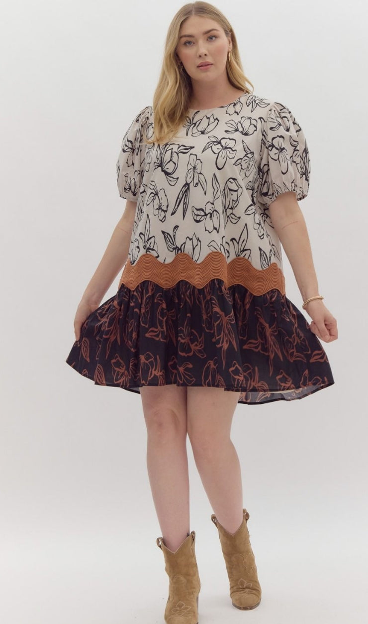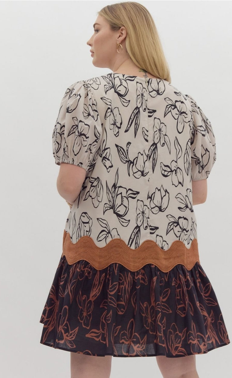 As a product expert, I present to you our Floral Print Puff Sleeve Mini Dress. With a beautiful floral print and ric rac trim, this dress is sure to make a statement. The round neck and elastic cuffs provide a comfortable fit, while the lining and lightweight fabric add to its quality. Complete with a zipper closure for easy wear, this dress is perfect for any occasion.