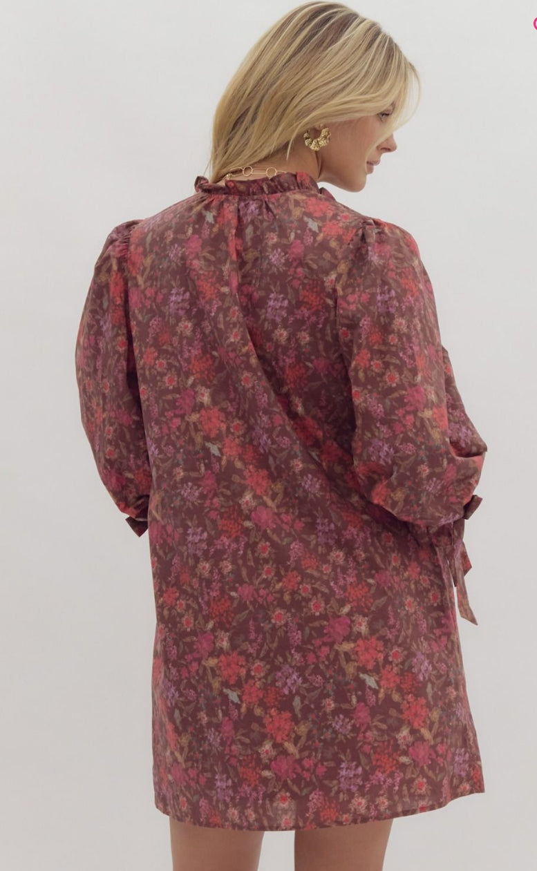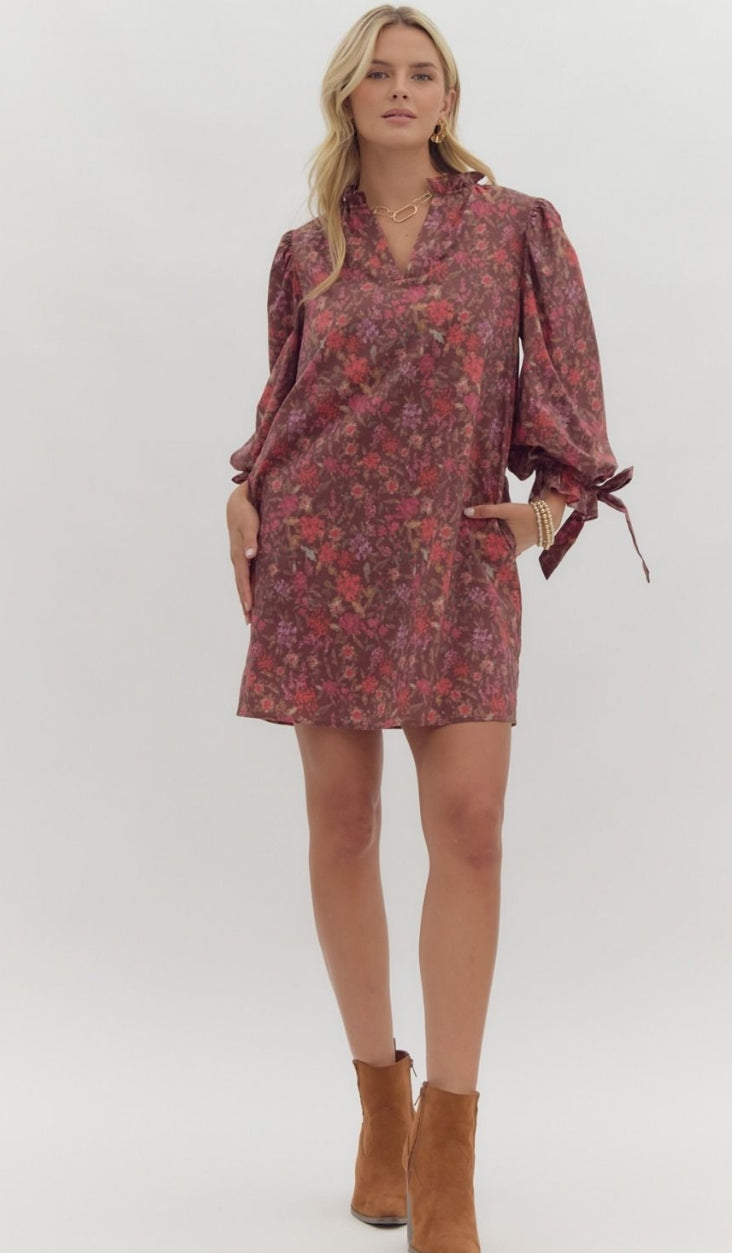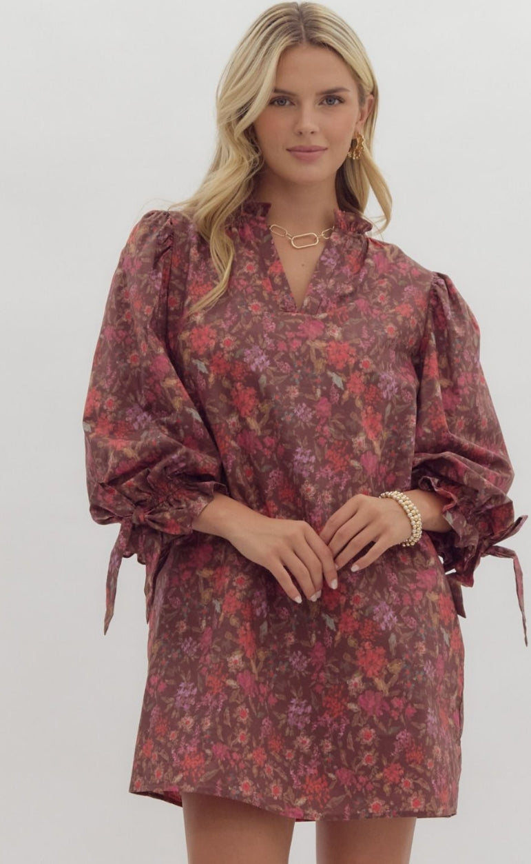 Floral printed poplin pullover dress featuring 3/4 elastic opening sleeve with secured ribbon detail along with side pockets. Round neck with ruffle finish and clean placket finish. Unlined. Non-sheer. Woven. Lightweight.