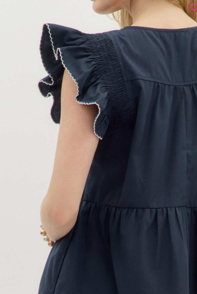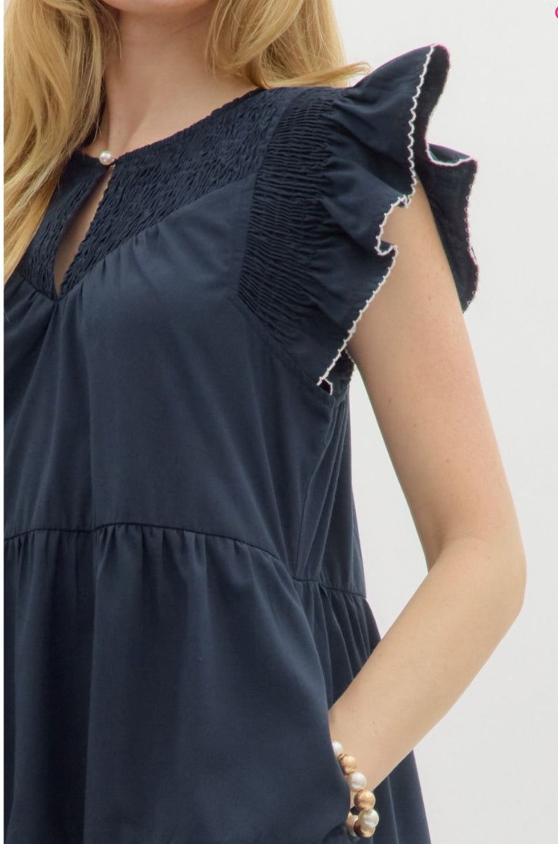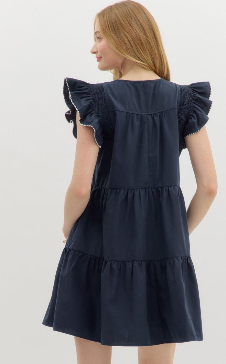 Solid picot edge smocked flutter sleeve tiered mini dress featuring pearl accented keyhole button closure at front smocked V-yoke. Pockets at sides. Lined. Woven. Non-sheer. Lightweight.