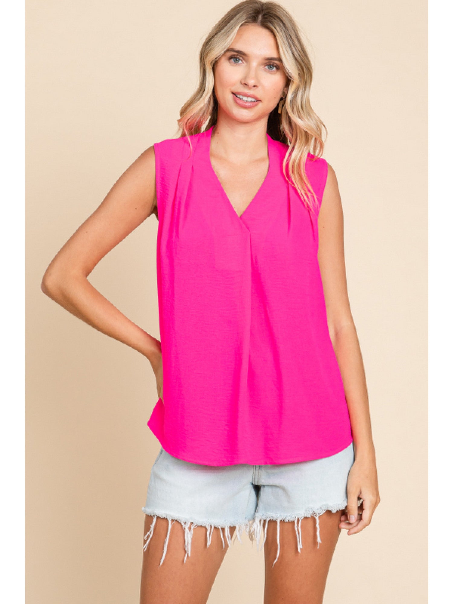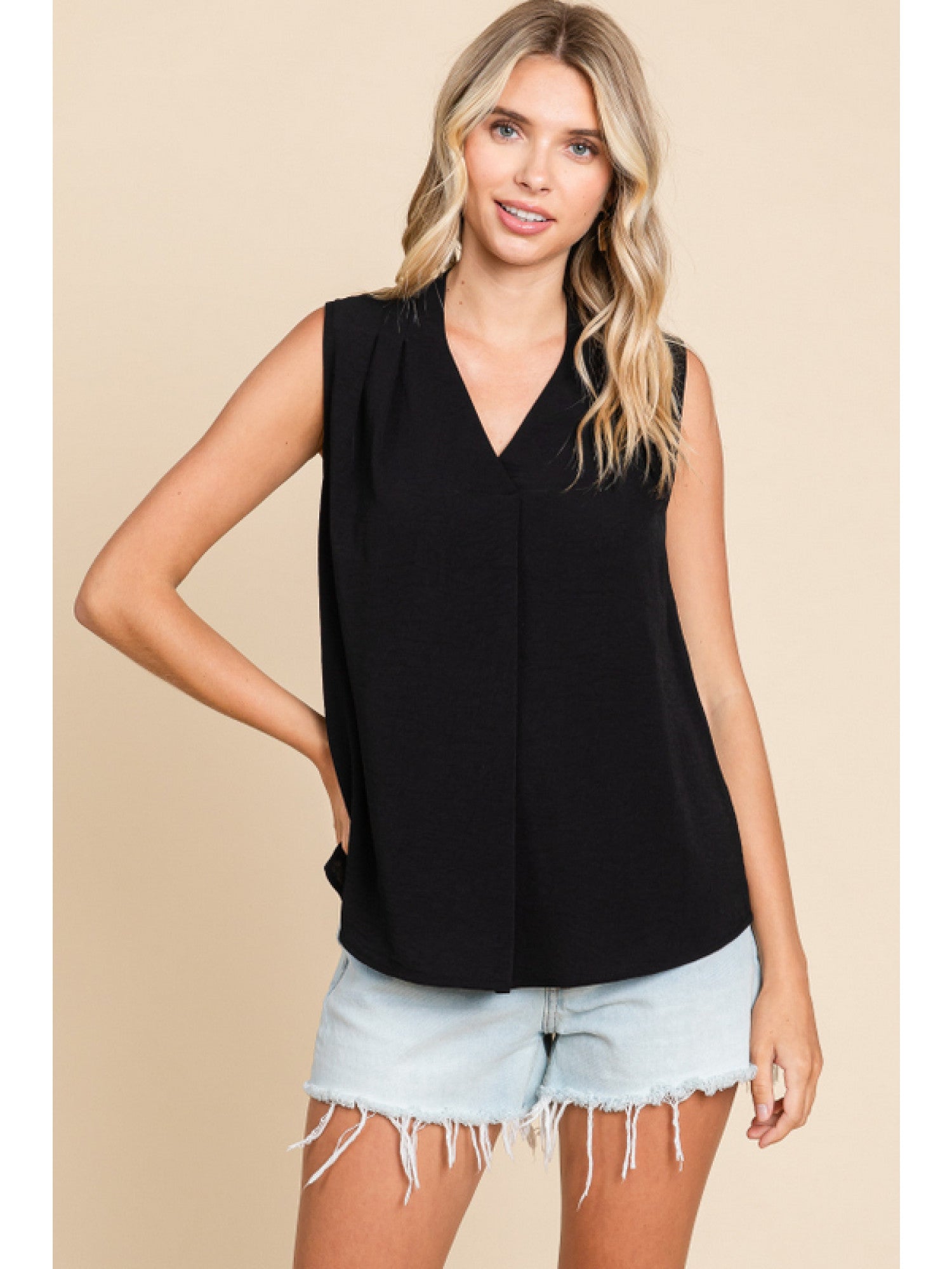 This solid sleeveless top features a flattering V-neck and tucked detailing, making it a versatile and stylish addition to any wardrobe. The sleek design and comfortable fit provide both fashion and functionality, making it perfect for any occasion.