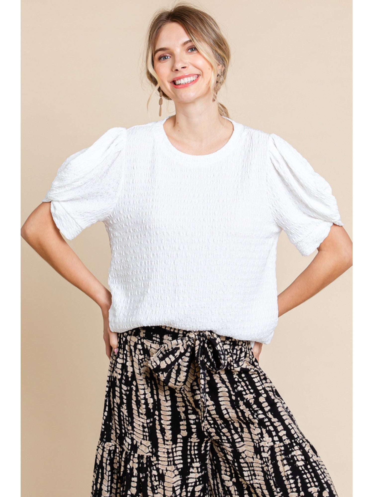 Introducing our expertly crafted top, featuring a textured design and flattering U-neck. The short draped sleeves add a touch of elegance and versatility to this piece. Perfect for any occasion, this top is guaranteed to elevate your wardrobe. Experience the best in style and comfort with our top.
