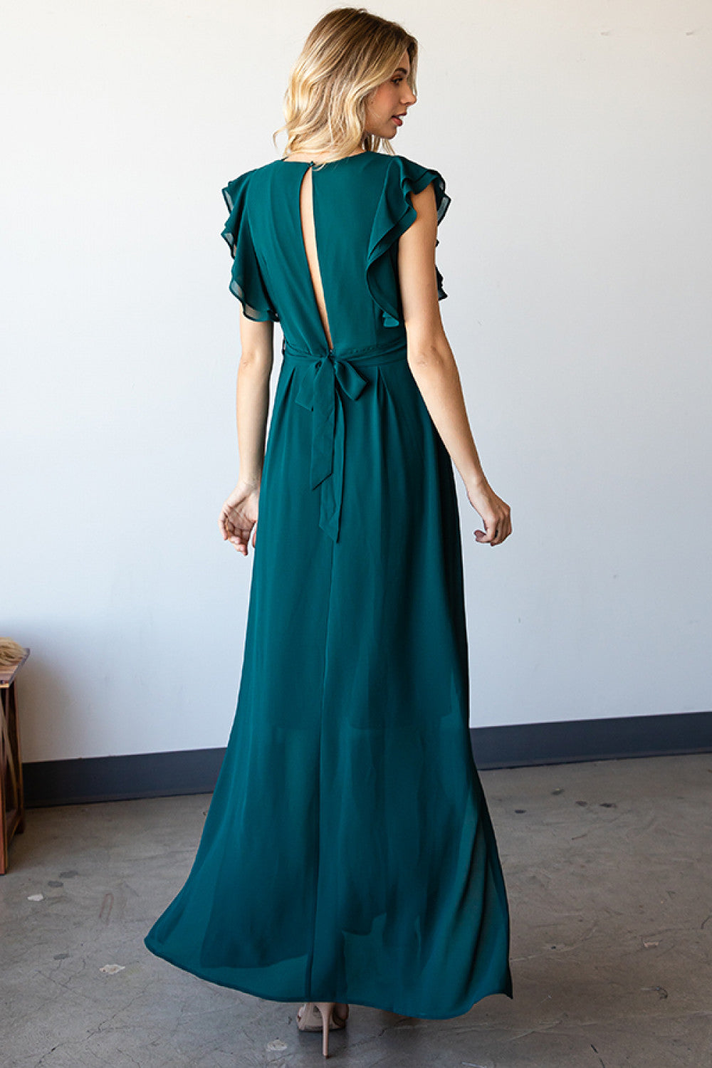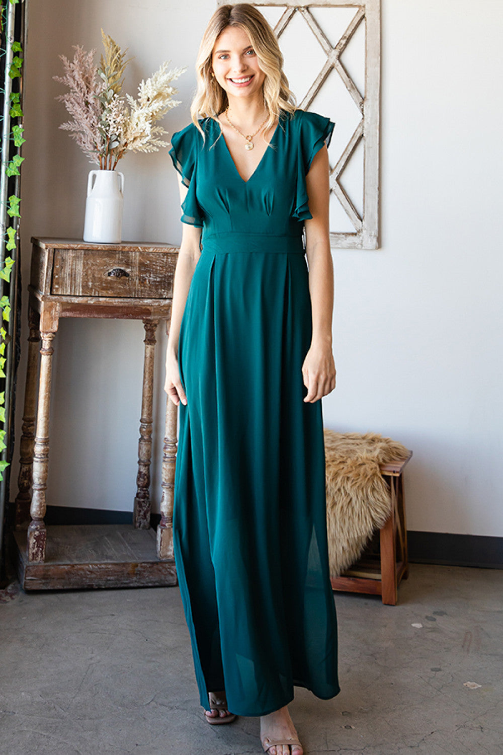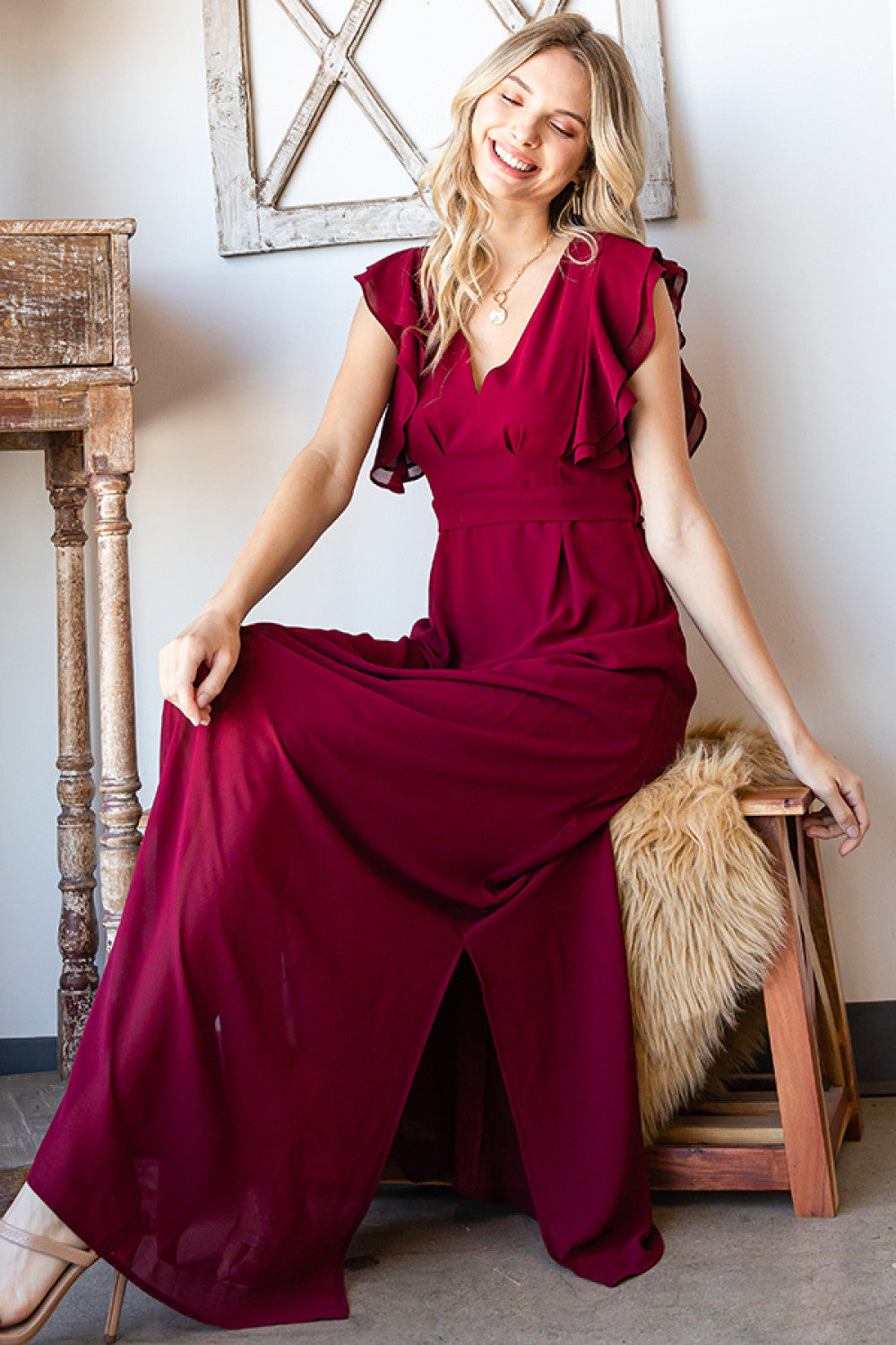 SOLID COLOR CHIFFONE SIDE SLIT MAXI DRESS FEATURING TIERED RUFFLE SHOULDER, V NECKLINE, LINED, AND BACK KEYHOLE CLOSURE.
