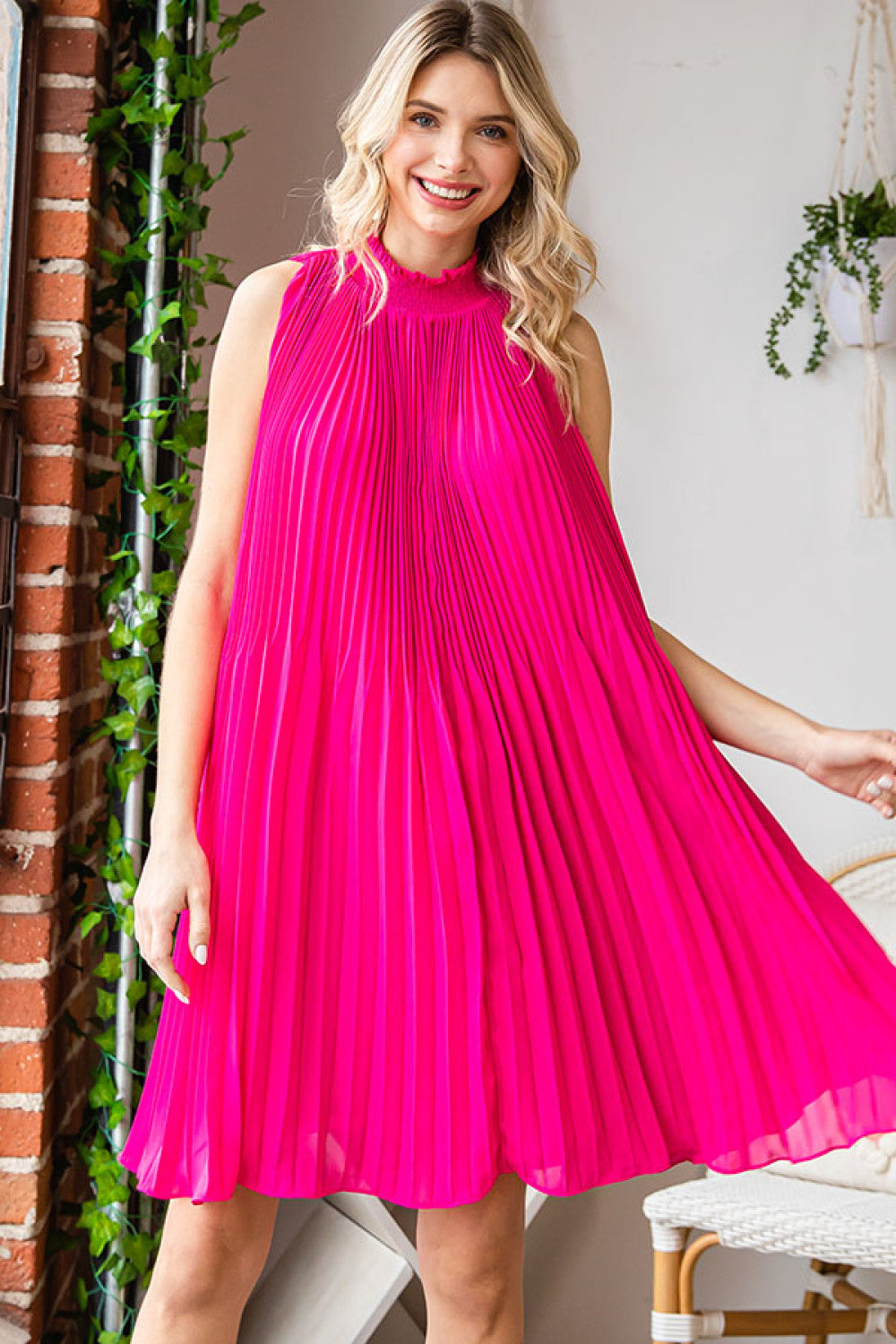 SOLID COLOR SLEELVELESS PLEATED SHORT DRESS FEATURING HOOK KEYHOLE CLOSURE SMOCKED MOCK NECKLINE AND LINING.