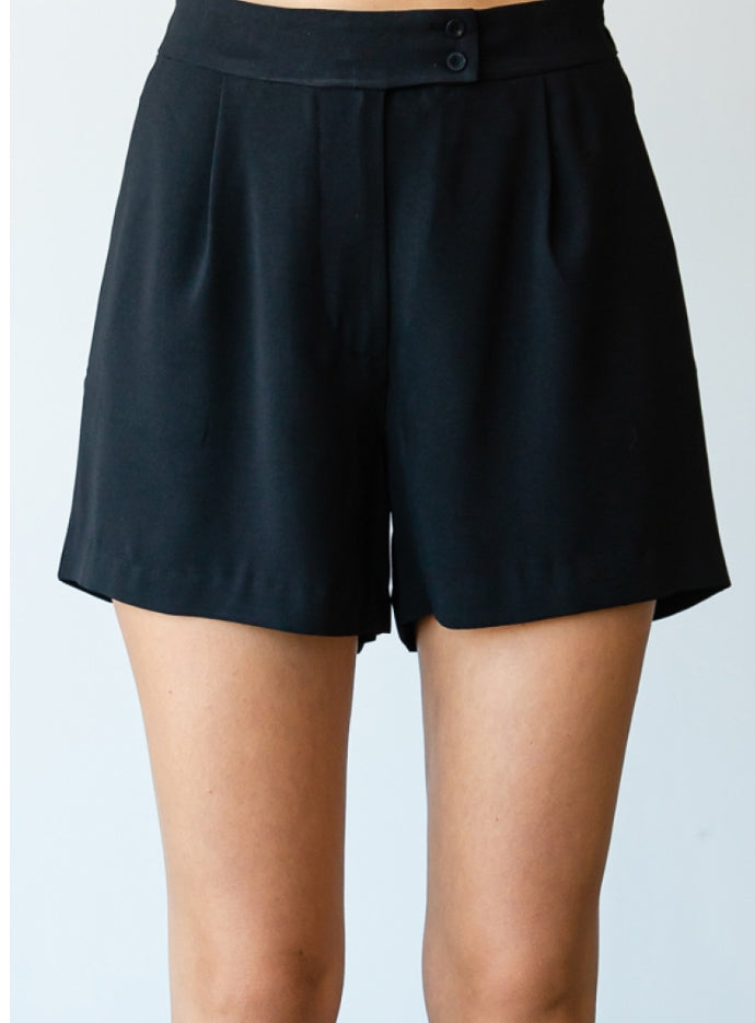 SOLID COLOR WOVEN HIGH WAIST SHORTS FEATURING BUTTON CLOSURE ZIPPER FRONT, ELASTIC BANDED ON THE BACK WAIST, AND POCKETS ON THE SIDES.