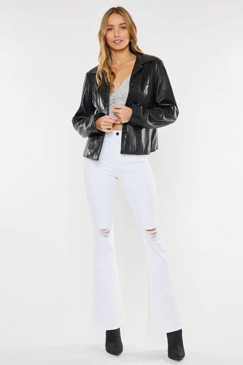 Petite-Cropped bootcut jeans with a modern trendy vibe available in crisp white and black. Featuring waist-accentuating fit, mild fading, whiskering, and unique uneven scattered hem.