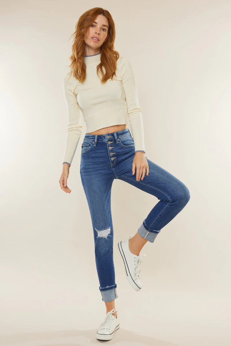Our Sparrow High Rise Cigarette Leg Jeans are full of flare to add to your next outfit! Comes in a high-rise fit and tapers down to a folded hem with light distress. These dark wash cigarette leg jeans have medium whiskering and light fading with knee destruction for that extra lived-in look. Features a 5-pocket style, 5-button front closure, and 3-inch folded hem.