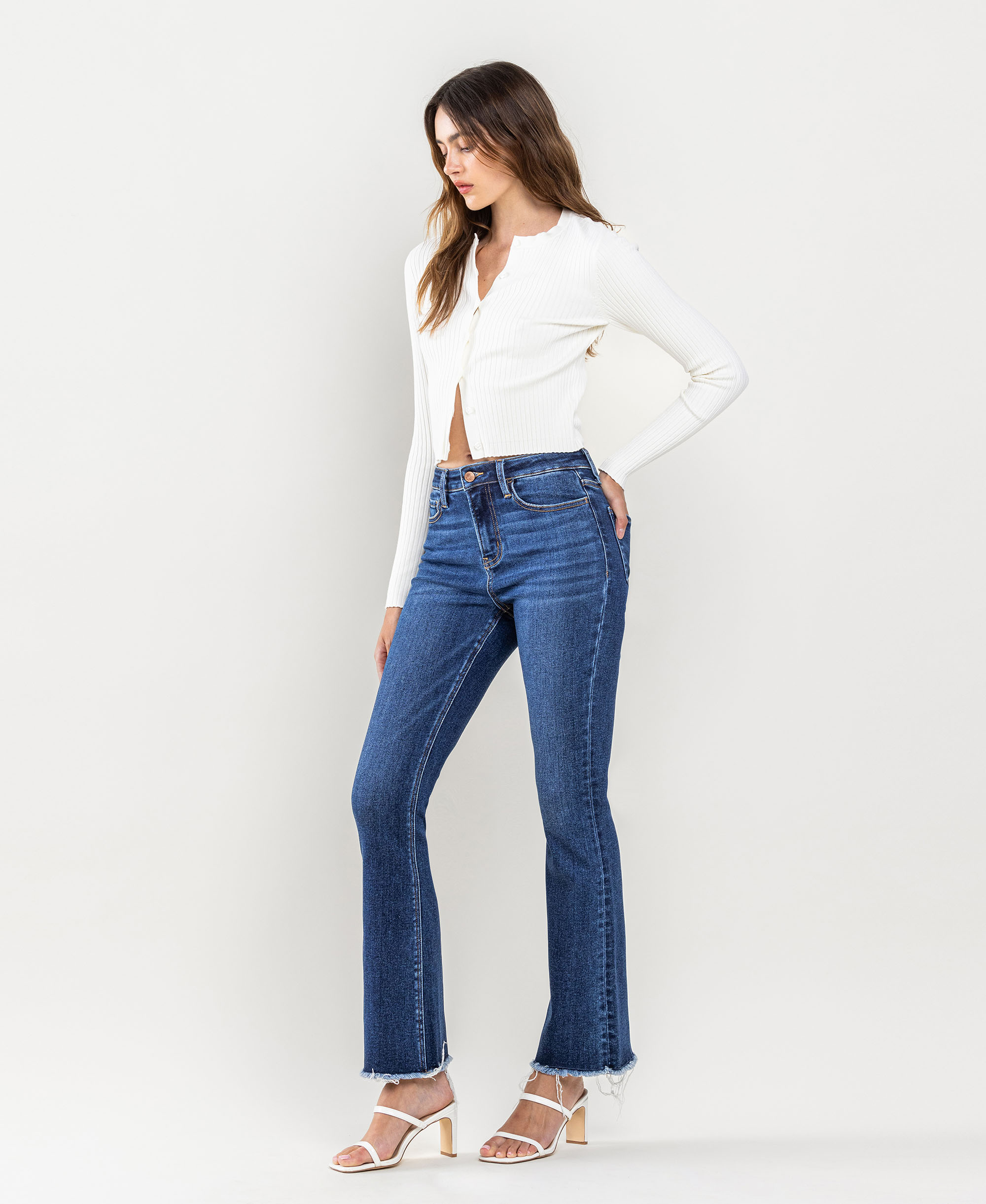 - COMFORT STRETCH DENIM, HIGH RISE WAIST, RAW HEM, FULL LENGTH, BOOTCUT JEANS