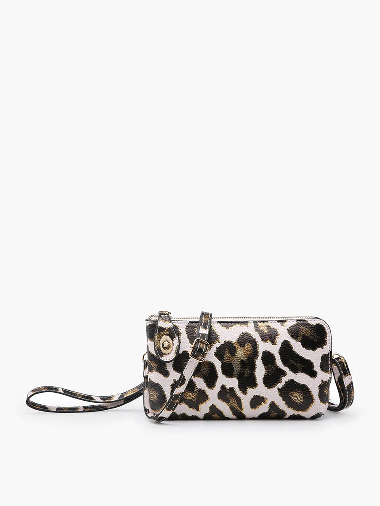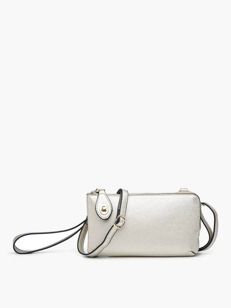 Keep your items secure with the Kendall! Includes a zipper and twist-lock closure to keep everything in place. Inside are cardholders and a large pocket. Both a wrist strap and a shoulder strap are included so you can use it as a clutch or wear it as a crossbody bag. Made of vegan leather. Dimensions: 8.5"L x 5"H x 0.5"D