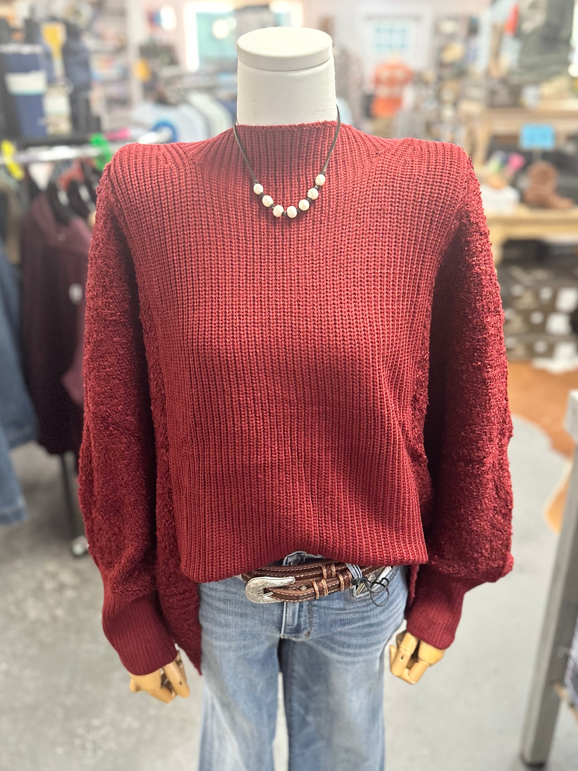 Introducing the PC5087 - a plus sized high-low turtleneck sweater in burgundy. Made with quality materials and precision, this sweater provides both style and comfort for the colder weather. Experience a flattering fit and cozy warmth with this must-have addition to your wardrobe.
