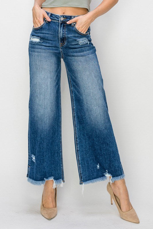 High Rise Side Slit W/ Frayed Hem Ankle Wide Leg Jeans