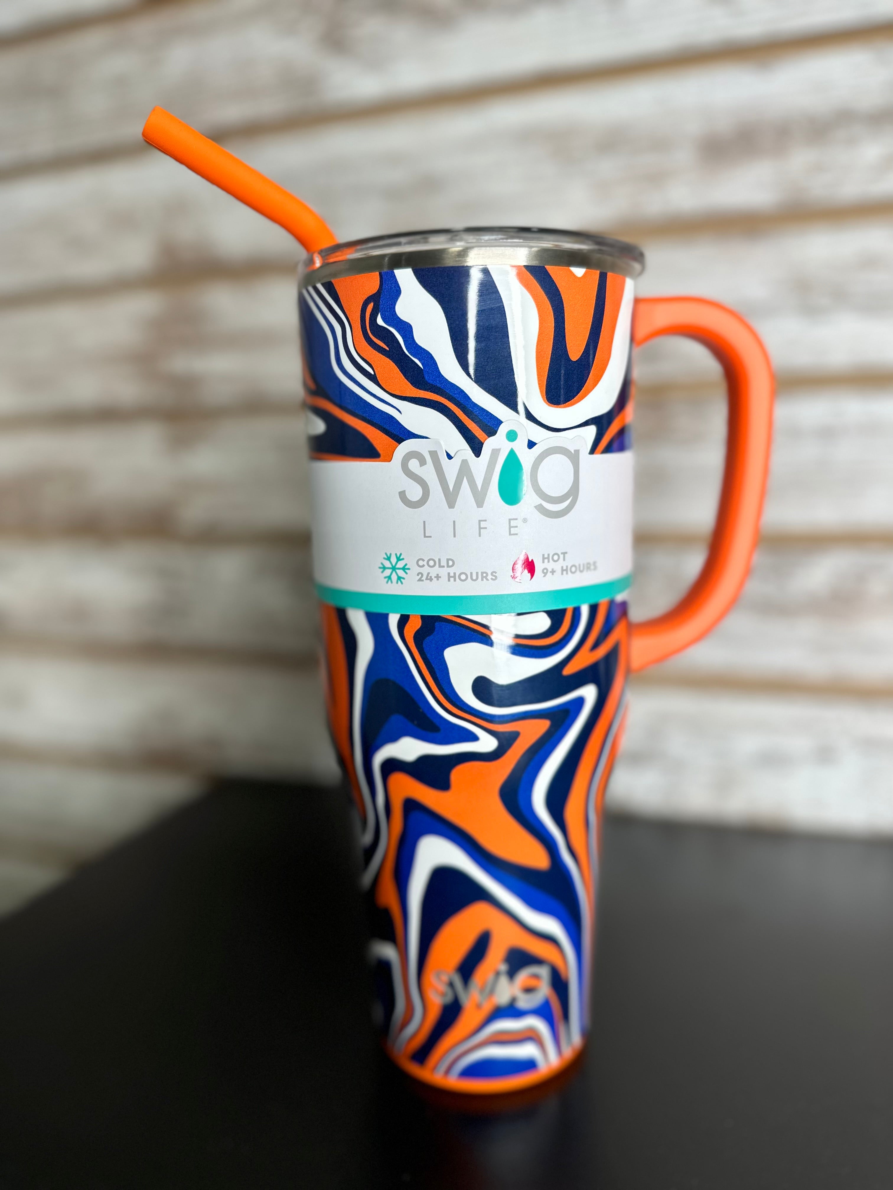 Hydrating has never been easier with our 40oz Mega Mug! The cup holder friendly frame, comfort-grip handle and flexi-tip straw with a standard, plastic straw base come together to create their new favorite Swig!