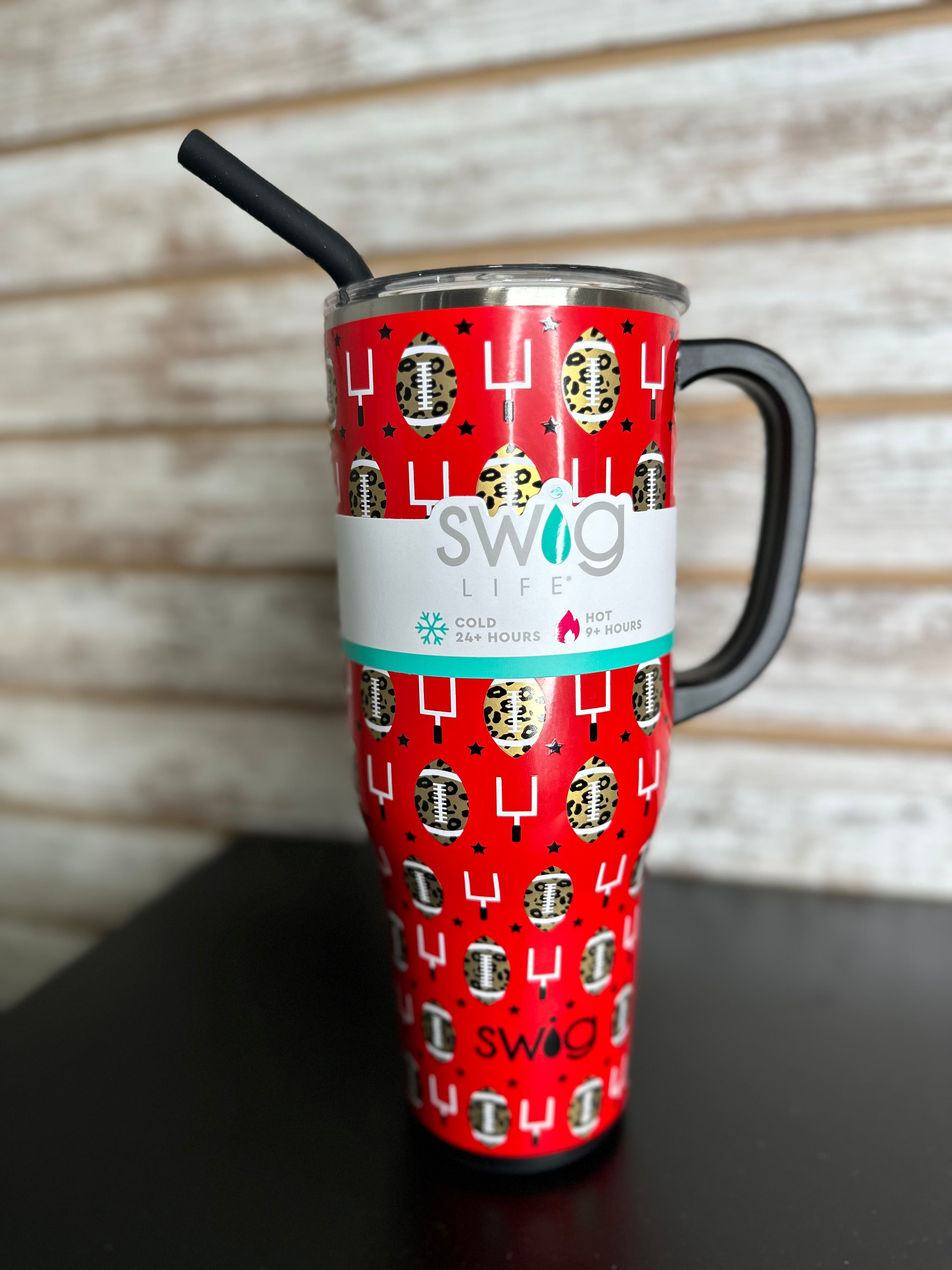 Hydrating has never been easier with our 40oz Mega Mug! The cup holder friendly frame, comfort-grip handle and flexi-tip straw with a standard, plastic straw base come together to create their new favorite Swig!