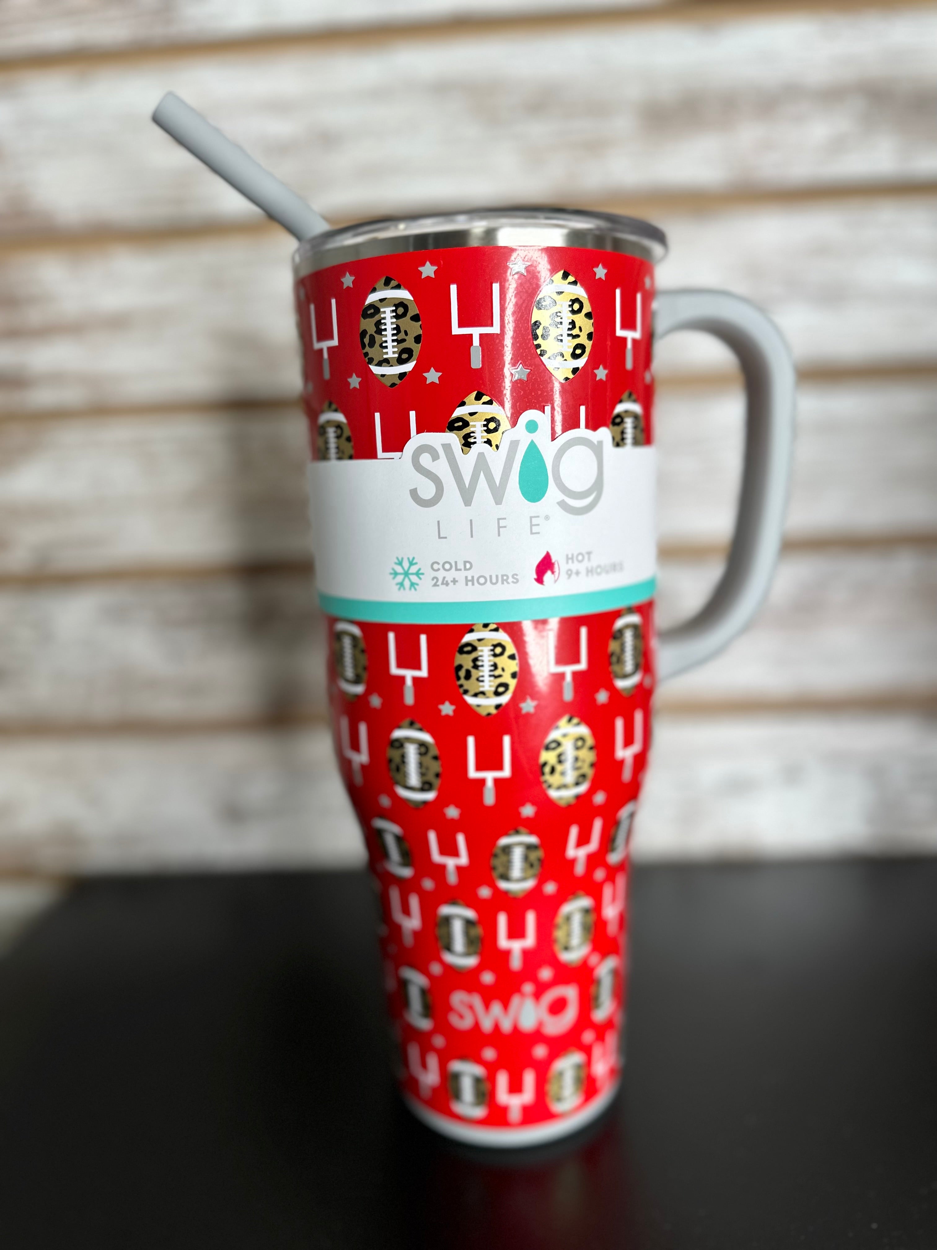 Hydrating has never been easier with our 40oz Mega Mug! The cup holder friendly frame, comfort-grip handle and flexi-tip straw with a standard, plastic straw base come together to create their new favorite Swig!