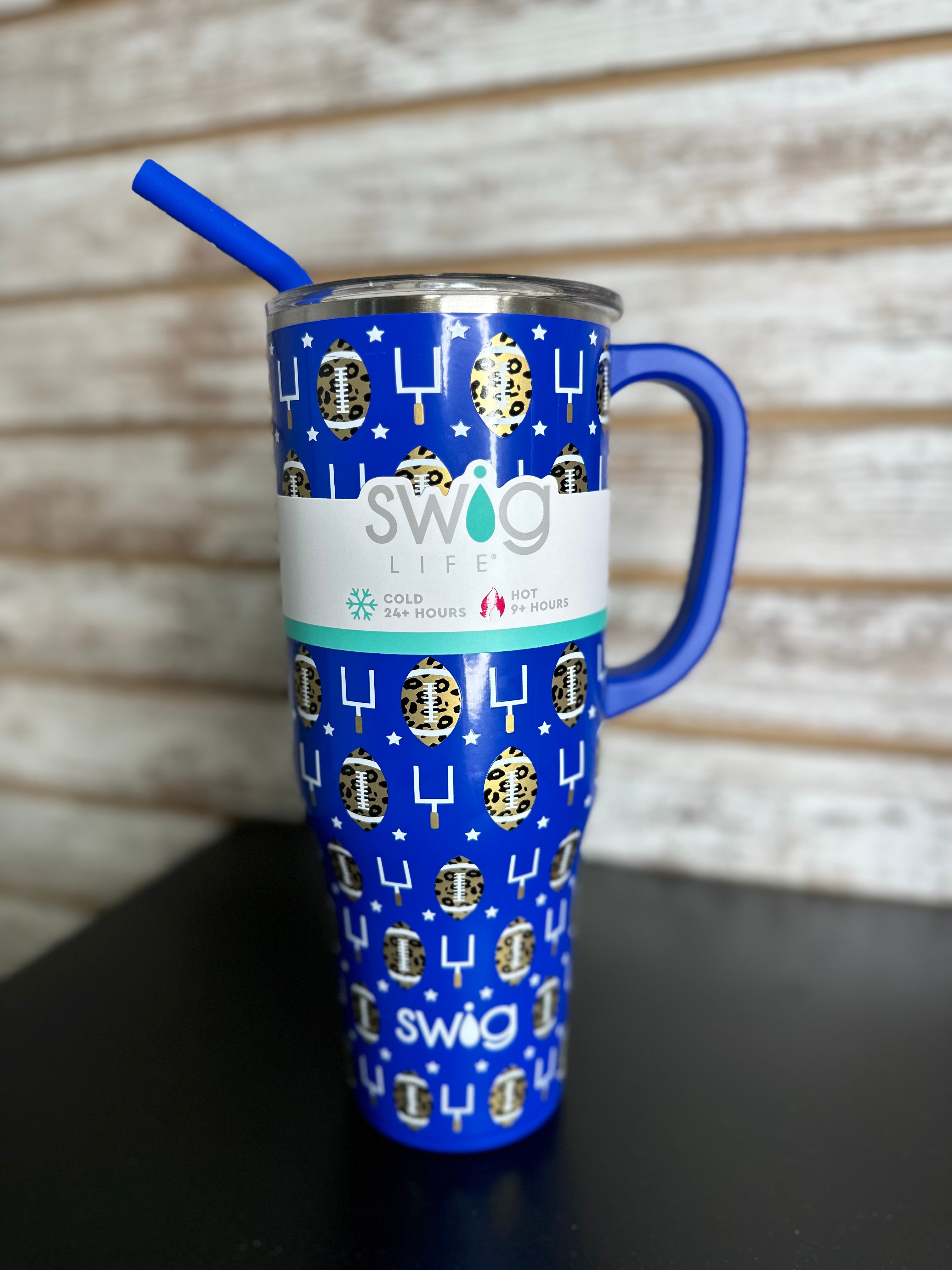 Hydrating has never been easier with our 40oz Mega Mug! The cup holder friendly frame, comfort-grip handle and flexi-tip straw with a standard, plastic straw base come together to create their new favorite Swig!