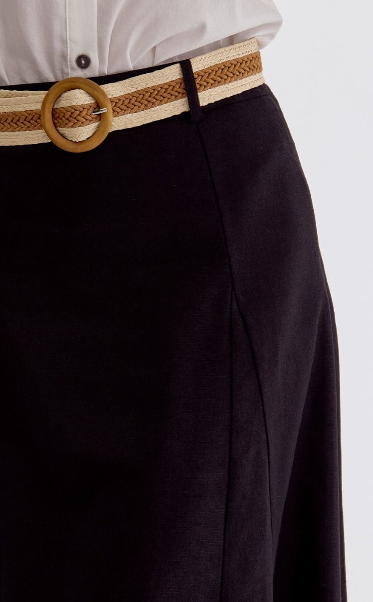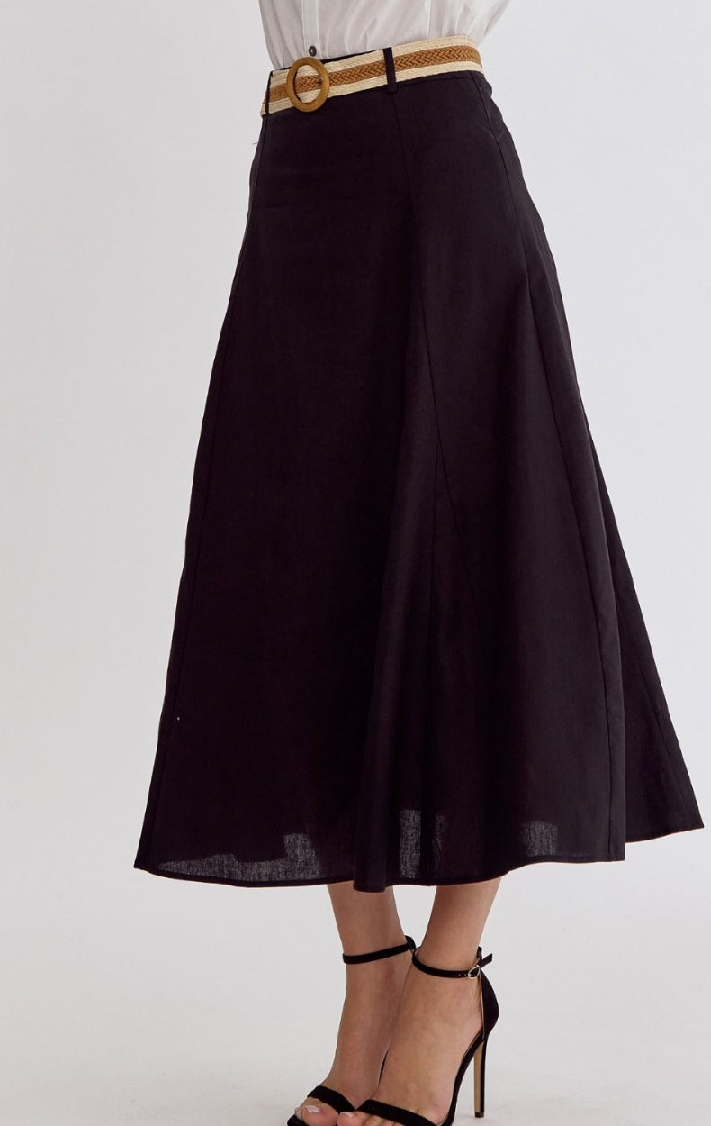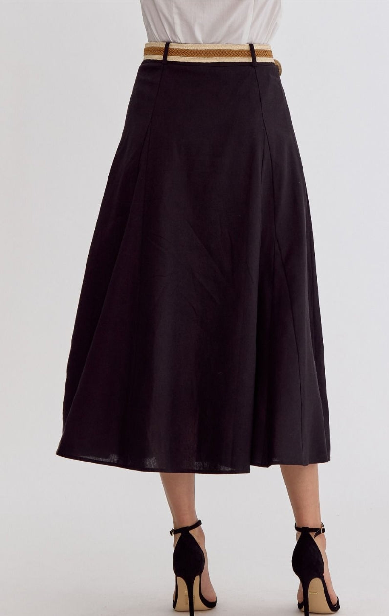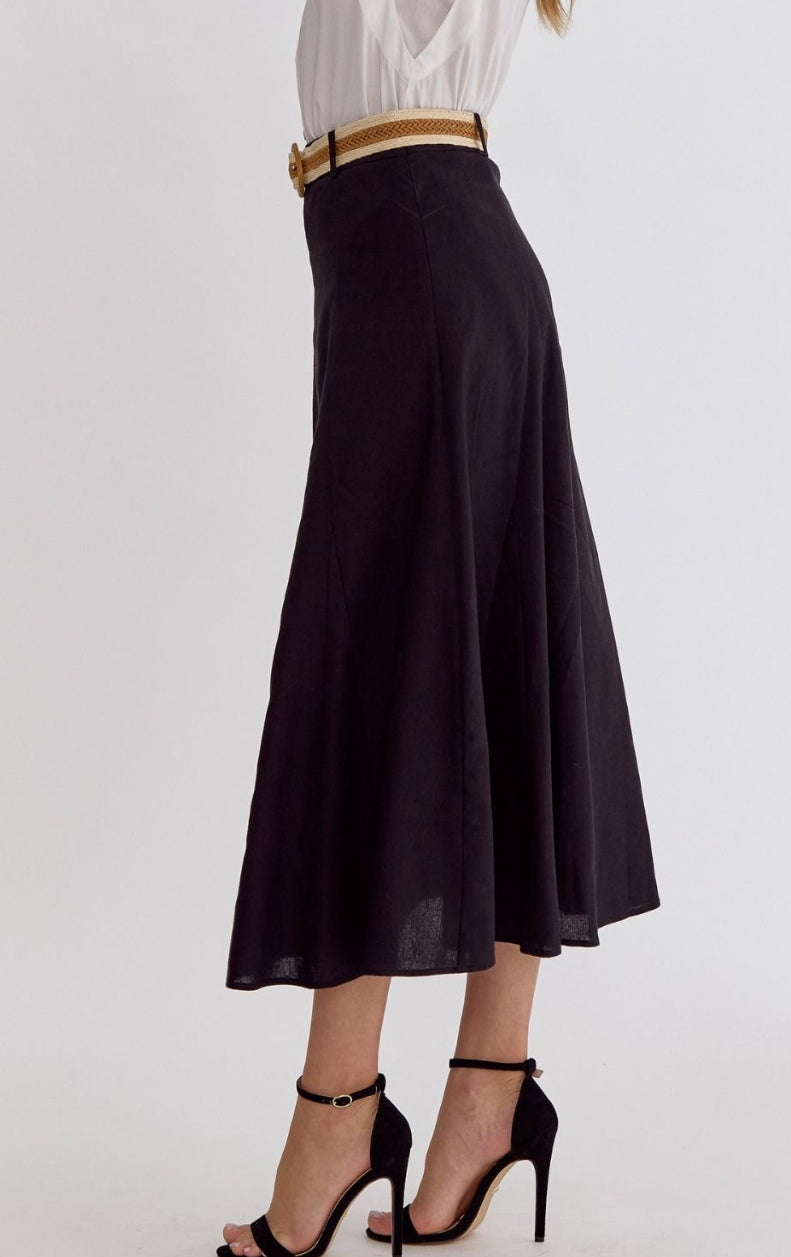Solid high waist flared midi skirt featuring belt detail at waist. Zipper closure at side Lined. Woven. Non-sheer. Lightweight.